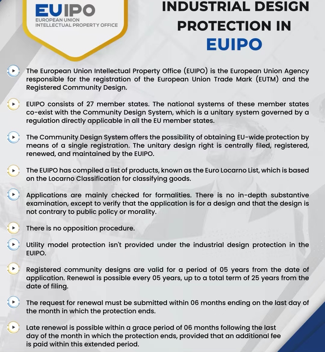 单一外观设计权由欧盟知识产权局集中备案和更新并维护。