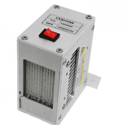 波长:385/395nm 电压:48V 功耗:400W 发光面:60*40mm 冷却:风冷 光折射幅度:>15w/cm² 应用领域:平板打印、喷码打印、数码打印等; 支持功能:0-10V调光,编码器自适应开关和调光,手自一体,红外感应开关灯。