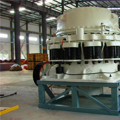 在圆锥破碎机的工作过程中,电动机通过传动装置带动偏心套旋转,动锥在偏心轴套的迫动下做旋转摆动,动锥靠近静锥的区段即成为破碎腔,物料受到动锥和静锥的多次挤压和撞击而破碎。动锥离开该区段时,该处已破碎至要求粒度的物料在自身重力作用下下落,从锥底排出 。