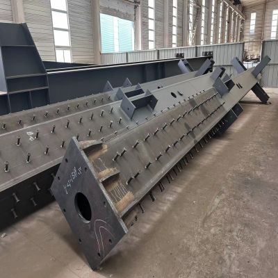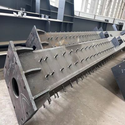 箱型柱也叫方箱柱,截面形状像一个大铁箱子,主要构成有四块壁板,上下两节点之间设置隔板组成,箱型柱具有抗扭和抗翘曲、刚度大、整体性能优、稳定性好,受力均匀、安装方便等特点。在高层框架和钢结构重型厂房中得到了广泛的应用。