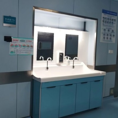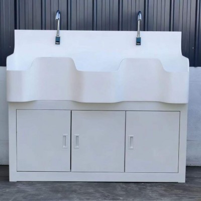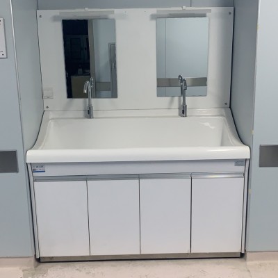 高分子洗手池材质特点:采用高分子材料一次吸塑成型,出水方式有:感应式、膝控式、脚踏式和手动开关,一台洗手池可客户要求选择单一出水方式或多种出水方式。洗手池分高背和低背,高背总高度1800mm,配有美容镜,照明灯,皂液器,可按客户要求配置烘手器和热水器。低背板无配置。
