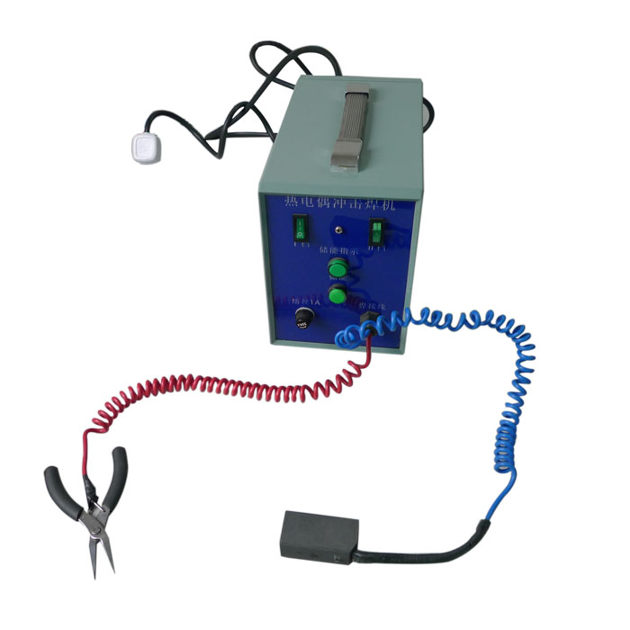 6. ,用手指抓住热电偶线和焊钳,使在焊钳上露出的芯线垂直于石墨平面碰触,听到 “啪”清脆的一声,焊接完成。再按一下储能按钮,为下一循环操作作好准备;