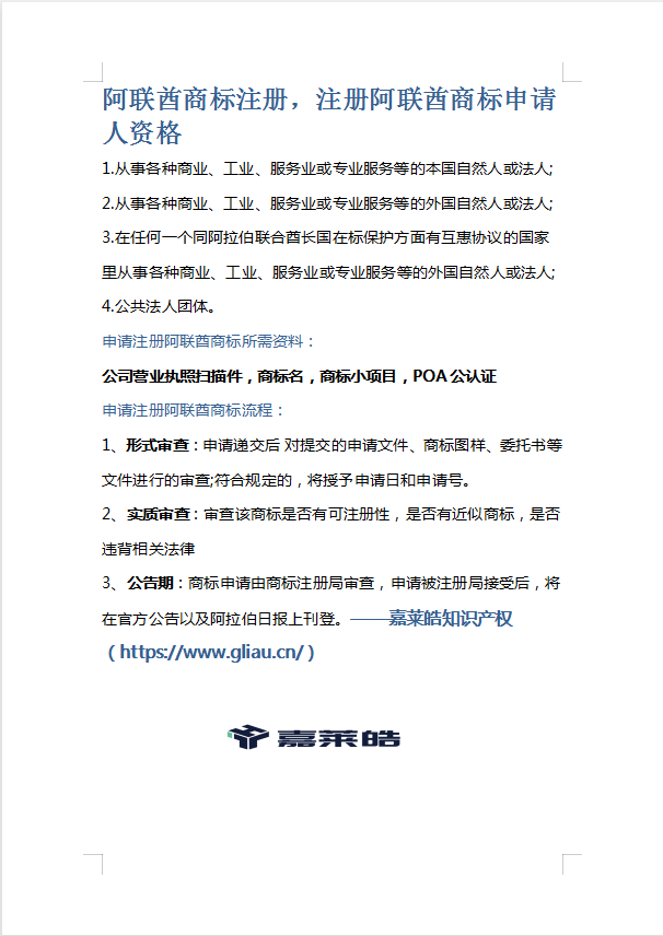 本网页所展示的有关【阿联酋商标注册,注册阿联酋商标申请人资格_商标注册申请_深圳嘉莱皓知识产权有限公司】的信息/图片/参数等由万联信息网的会员【深圳嘉莱皓知识产权有限公司】提供,由万联信息网会员【深圳嘉莱皓知识产权有限公司】自行对信息/图片/参数等的真实性、准确性和合法性负责,本平台(本网站)仅提供展示服务,请谨慎交易,因交易而产生的法律关系及法律纠纷由您自行协商解决,本平台(本网站)对此不承担任何责任。您在本网页可以浏览【阿联酋商标注册,注册阿联酋商标申请人资格_商标注册申请_深圳嘉莱皓知识产权有限公司】有关的信息/图片/价格等及提供【阿联酋商标注册,注册阿联酋商标申请人资格_商标注册申请_深圳嘉莱皓知识产权有限公司】的商家公司简介、联系方式等信息。