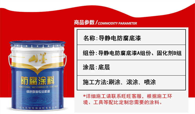 4、施工方式 导静电防腐蚀涂料,可采用普通喷涂、高压无气喷涂,刷涂等工艺。涂料施工试用期一般不大于四小时,气温高时,施工试用期会相应缩短,应现用现配。前一道涂层达到表干即可涂敷下一道。施工完毕应及时用溶剂清洗喷枪、输料管、油漆刷等,以免残留涂料固化影响下次使用。
